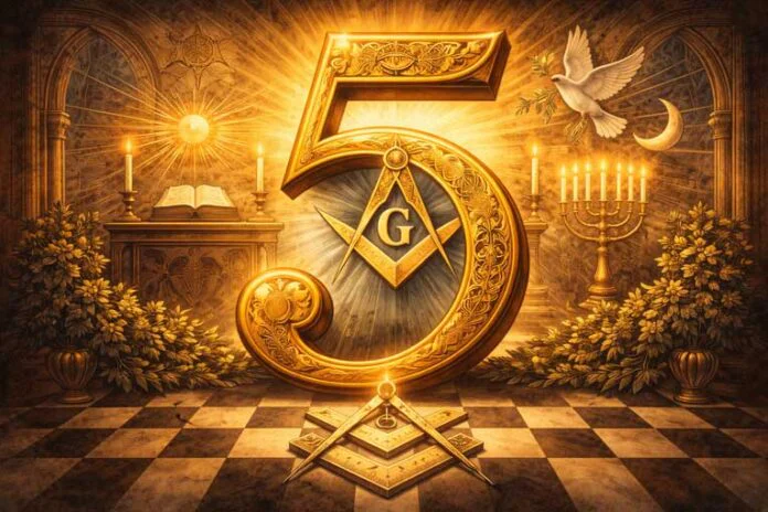 Le cinq occupe une place essentielle dans la symbolique maçonnique. Il est, avec le quatre et le sept, l’un des nombres qui reviennent fréquemment dans l’organisation des rites, des gestes et des représentations du travail initiatique. Dans la tradition pythagoricienne, il est considéré comme un signe d’union, parce qu’il se situe au milieu des neuf premiers nombres. Il est aussi le nombre nuptial, celui du mariage symbolique entre la Terre et le Ciel, entre le principe terrestre et le principe céleste. Il exprime ainsi l’équilibre, l’harmonie et la médiation entre les contraires.