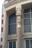 Une autre loge, située au 24, rue de Lens (architecte F. Roussel), se distingue par sa porte monumentale encadrée de deux colonnes de 9 mètres, inspirées des colonnes du temple de Salomon décrites dans la Bible par l’architecte Hiram. Les grilles des soupiraux, ornées d’un soleil levant rayonnant, reprennent un motif que Baert intègre également à la piscine bains-douches de Roubaix (1927-1932), aujourd’hui musée d’art et d’industrie André Diligent. Là, des demi-rosaces monumentales orientées est-ouest illuminent le bassin, tandis qu’une tête de « Grand Architecte de l’Univers » déverse l’eau, évoquant les rituels d’initiation. En 1924, Baert conçoit son agence au 6, rue de Valmy, dont la façade arbore un bas-relief aux outils maçonniques en béton façonné comme du grès des Vosges.
