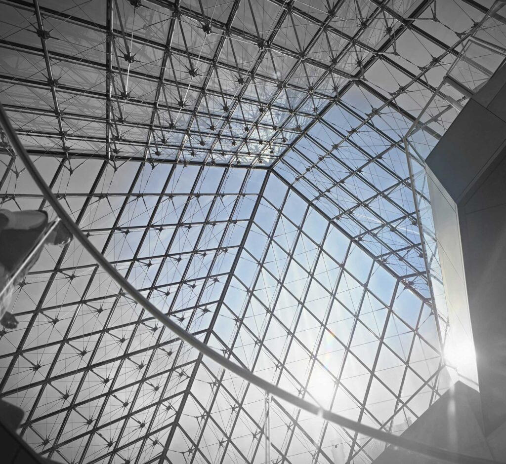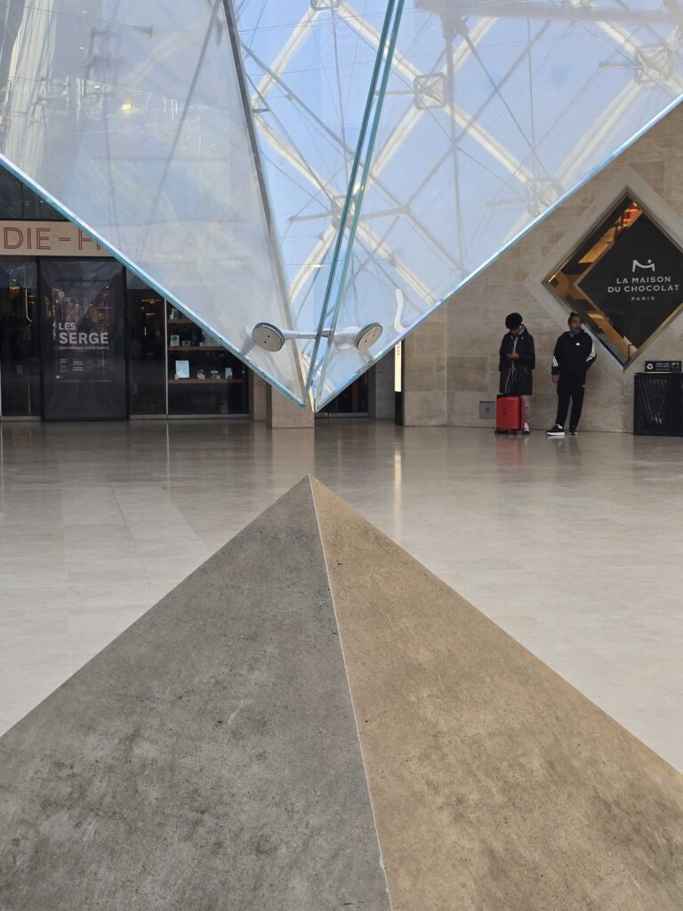Sous la cour, la pyramide inversée complète le signe, comme si l’architecte avait voulu écrire la Table d’émeraude à même Paris. Ce qui est en bas répond à ce qui est en haut. Deux pointes s’appellent sans se toucher, et l’on comprend que l’initiation n’est ni ascension seule ni seule immersion, mais passage entre polarités. La pointe de verre suspendue désigne l’invisible autant qu’elle éclaire l’itinéraire des visiteurs qui se cherchent. Ainsi la verticalité se fait douce ; elle ne commande pas, elle invite. Installée en 1993 au Carrousel, elle oriente et pacifie, elle donne au flux moderne du commerce un repère de silence.