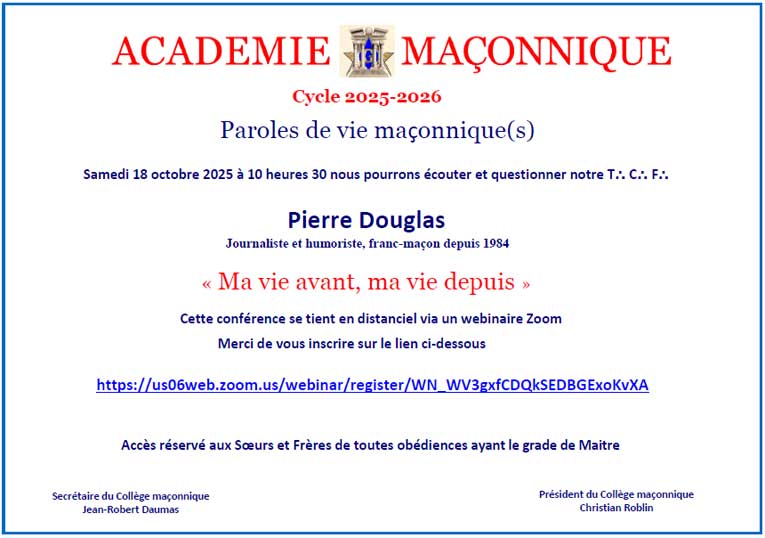 Dans son cycle annuel 2025-2026 ayant pour thème général : « Paroles de vie maçonnique(s) », l’Académie maçonnique Paris recevra le T⸫ C⸫ F⸫ Pierre Douglas.