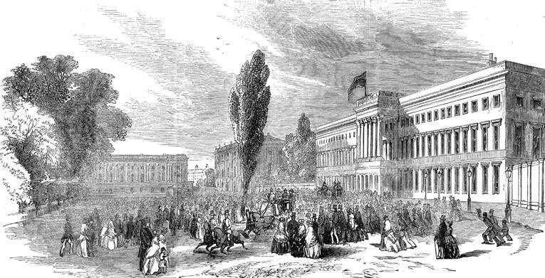 Départ pour Laeken lors de la visite en Belgique de la reine Victoria du Royaume-Uni, Palais royal (Bruxelles), août 1852. — La légende de l’Univers illustré est : « Départ du roi Léopold de Belgique de son château de Laeken, le 21 juillet. » Celle-ci comporte deux erreurs : il ne s’agit pas du Château royal de Laeken, mais du Palais royal de Bruxelles, et la date n’est pas le 21 juillet 1863, mais un certain jour d’août 1852…