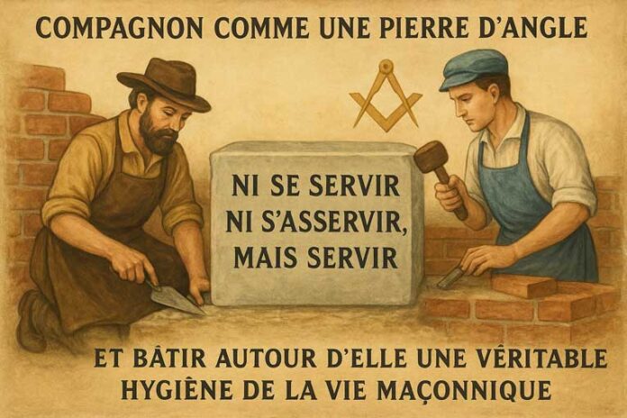 Nous allons prendre la devise des compagnons comme une pierre d’angle et bâtir autour d’elle une véritable hygiène de la vie maçonnique. « Ni se servir ni s’asservir, mais servir » n’est pas un slogan mais une discipline.