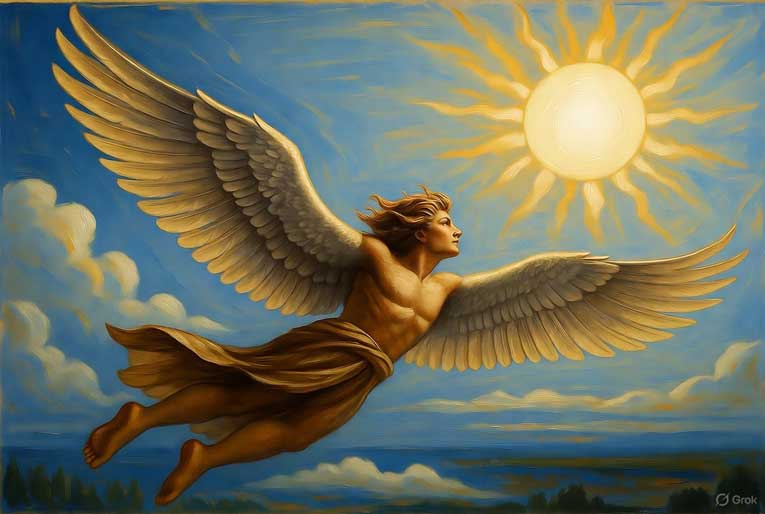 Ne pouvant s’échapper par la terre ou la mer, Dédale, avec son génie créatif, décide de défier les lois de la nature. Il fabrique des ailes pour lui et son fils en utilisant des plumes d’oiseaux et de la cire comme liant. Avant leur envol, Dédale avertit Icare de suivre un chemin modéré : ne pas voler trop bas, au risque de s’écraser dans la mer, ni trop haut, de peur que la chaleur du soleil ne fasse fondre la cire de ses ailes. Icare, exalté par la sensation de liberté et grisé par l’ivresse du vol, ignore les conseils de son père. Il s’élève toujours plus haut, jusqu’à ce que le soleil fasse fondre ses ailes. Incapable de voler, Icare chute et se noie dans la mer, qui porte désormais son nom : la mer Icarienne.