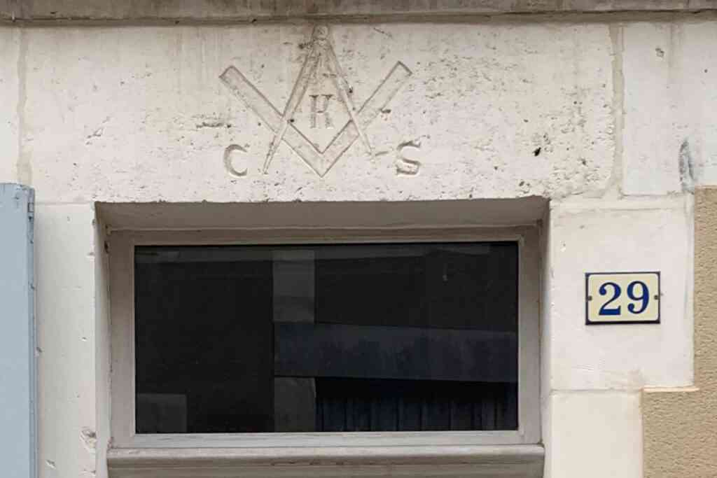 C∴ K∴ S∴ et décor maçonnique au-dessus d’une porte de maison du village d’Irancy