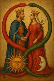 Cette alliance androgyne, évoquée et célébrée dans les étapes précédentes du processus d’individuation, est à présent à l’œuvre comme une fonction supplémentaire rassemblant les moitiés de soi-même qui auparavant se tournaient le dos. Le corps et l’esprit, le masculin et le féminin, entrecroisent à présent spontanément leurs vertus complémentaires pour donner naissance à une troisième nature parée des vertus de ses géniteurs, et surtout dotée de vertus propres mises en œuvre par les Mages au 57è, par les Brahmanes au 58è, et par les Pontifes au 59è degré de la Maçonnerie égyptienne.