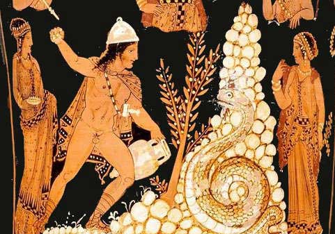 Cadmée se délivre également de ce processus cyclique en tuant le dragon, comme le relate la mythologie grecque. Il peut alors consacrer son énergie à devenir soi-même, en découvrant les yeux grands ouverts ce que la vie lui réserve et ce qu’il en fera en toute conscience. Ces yeux sont ceux des statues égyptiennes et grecques, les yeux des scribes égyptiens assis en lotus, ouverts sur un univers intérieur en mouvement plein de voies offertes aux êtres en recherche. En alchimie, le dragon est de nature double et veille à la porte du Jardin des Hespérides, et « tuer le dragon » signifie le faire disparaître quand sa nature double se résoud en une seule. Alors, « la porte du Jardin est ouverte, et on peut y cueillir sans crainte les pommes d’or, comme l’expliquent les livres des vrais Philosophes Spagyriques. » (Dom Pernety, Dictionnaire Mytho-Hermétique)