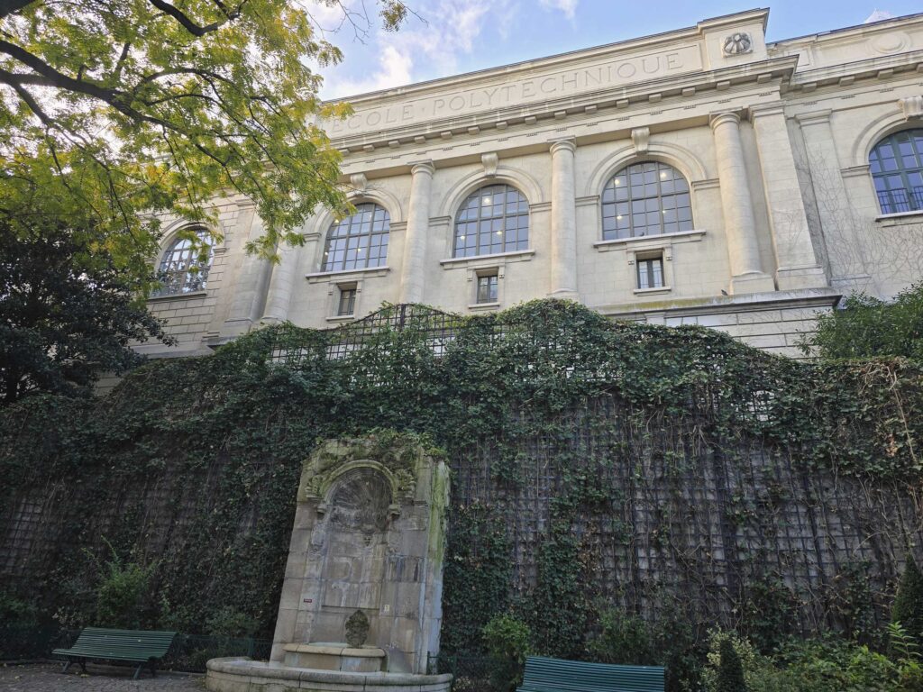 Ici, un escalier monumental conduit aux anciens bâtiments de l’École polytechnique, tandis qu’en contrebas une fontaine transplantée – dite Childebert – déploie ses cercles d’eau comme autant d’ondes de pensée.