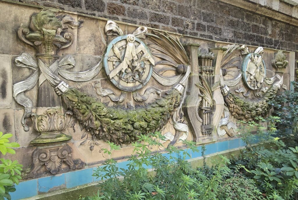Ici, des fragments d’histoire sont venus s’y abriter : céramiques du palais des Beaux-Arts de 1889, niches Renaissance de l’ancien Hôtel de Ville, statues déplacées, fondues, recréées.