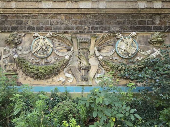 Ici, des fragments d’histoire sont venus s’y abriter : céramiques du palais des Beaux-Arts de 1889, niches Renaissance de l’ancien Hôtel de Ville, statues déplacées, fondues, recréées.