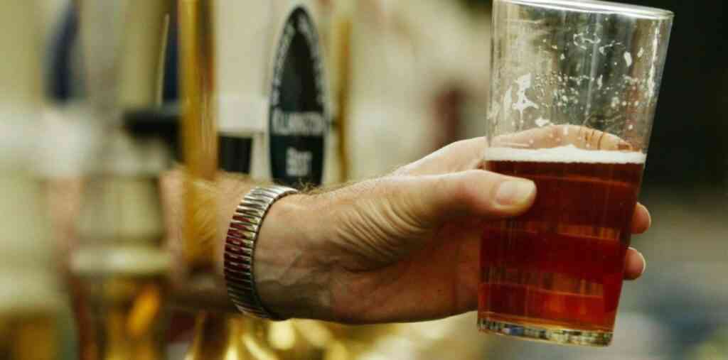 Il tient sa chope d’une main ferme, non pour boire, mais pour la frapper doucement sur le bois de la table.
