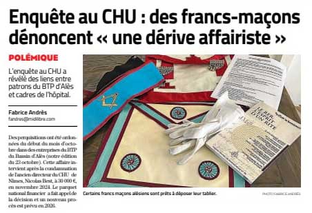 Une enquête judiciaire sur des marchés publics irréguliers au Centre hospitalier universitaire (CHU) de Nîmes met en lumière des liens entre entrepreneurs du BTP du Bassin d’Alès, cadres hospitaliers et élus locaux, tous affiliés à la même loge de la Grande Loge Nationale Française (GLNF). Dans un article publié ce vendredi par le Midi Libre, des Francs-maçons gardois, anonymes mais expérimentés, expriment leur malaise face à ce qu’ils qualifient de « dérive affairiste ».