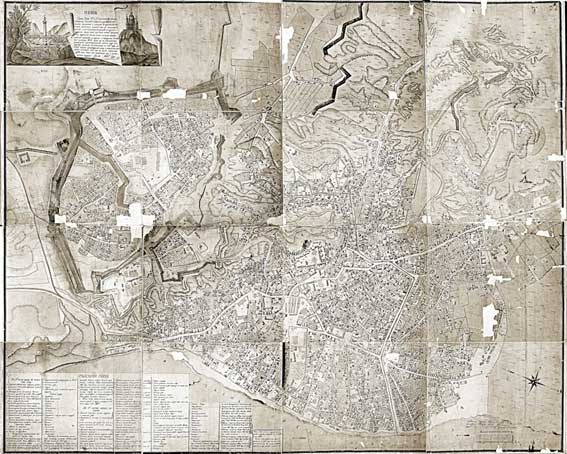Plan de Kiev par Melenski en 1803 : La ville haute est enserrée dans ses fortifications et c’est la ville basse (Podil) qui concentre l’essentiel du développement urbain.