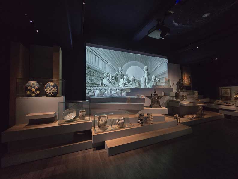 La collection, riche de plus de 3000 pièces du XVIIIᵉ siècle à nos jours, se déploie comme un alphabet de la Tradition : tapisserie de la « légende d’Hiram », textiles rituels, arts et métaux, documents, objets d’atelier : la matière et l’esprit s’y répondent.