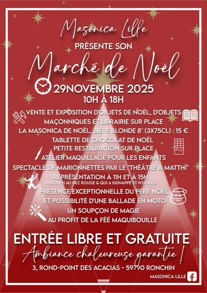 Nous entrerons dans Masonica Lille comme on franchit le seuil d’un estaminet de lumière, fenêtres embuées de rires, tables rapprochées, mains serrées par réflexe d’humanité. De 10 h à 18 h, au 3, rond-point des Acacias, 59790 Ronchin, le Marché de Noël maçonnique déploiera ses guirlandes comme un tracé de cordelettes, ses stands comme des colonnes d’un Temple fait de cœurs.