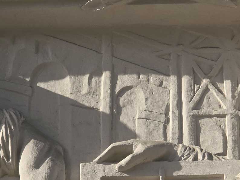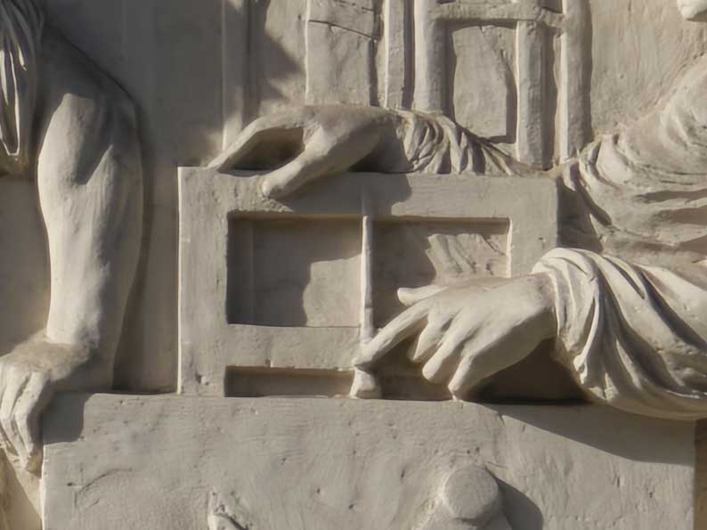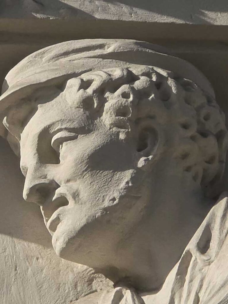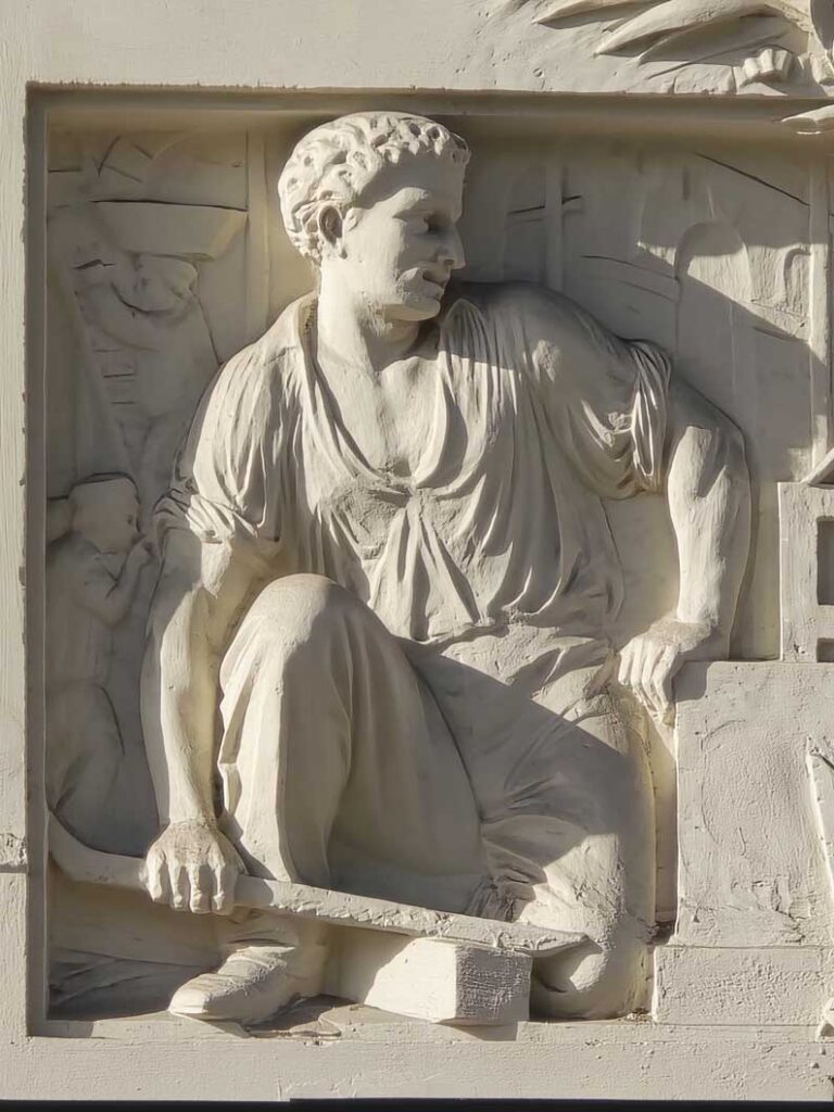 Levons les yeux ! Au-dessus de la porte d’un commerce, un bas-relief ouvre son atelier de pierre. Deux bâtisseurs s’y répondent comme dans un miroir fraternel.