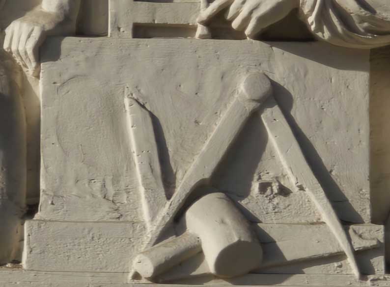 Ainsi la façade raconte la chaîne opérative – mise au trait, taille, montage – et, sur ses bords, de petites figures murmurent la transmission : on devient par le faire, on apprend par le service. Elle rappelle aussi l’ancienne Société de secours mutuels des Artisans Maçons, fraternité de métier dont les emblèmes chevauchent naturellement ceux de la Maçonnerie spéculative : entraide, travail réglé, perfectionnement de soi.