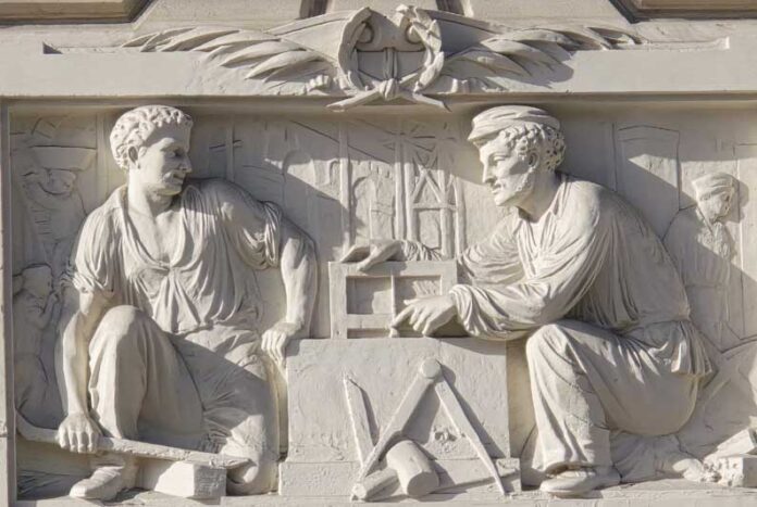 Ainsi la façade raconte la chaîne opérative – mise au trait, taille, montage – et, sur ses bords, de petites figures murmurent la transmission : on devient par le faire, on apprend par le service. Elle rappelle aussi l’ancienne Société de secours mutuels des Artisans Maçons, fraternité de métier dont les emblèmes chevauchent naturellement ceux de la Maçonnerie spéculative : entraide, travail réglé, perfectionnement de soi.