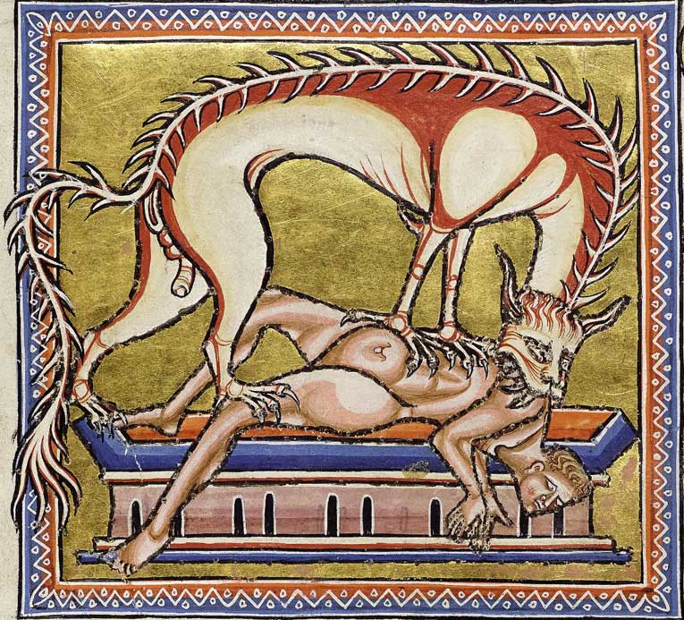 De nombreux bestiaires consacrent une section à un animal mangeur d’humains terrifiant, la manticore. Avec sa tête humaine, son corps de lion et sa queue de scorpion, cette créature ressemblant à un sphinx était connue des érudits médiévaux grâce aux écrits de plusieurs auteurs classiques, dont Aristote et Pline l’Ancien. Selon le Bestiaire de Rochester, créé en Angleterre, la voix sifflante de la manticore « ressemblait au son des flûtes et des cornemuses ». D’origine perse (martikhoras, « mangeur d’hommes »), cette créature mythique était probablement inspirée des tigres d’Inde mal décrits par les voyageurs. Dans l’Ashmole Bestiary, elle bondit sur trois rangées de dents, dévorant ses victimes corps et biens – allégorie des hérétiques qui séduisent par de belles paroles avant de détruire l’âme.