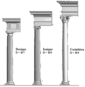 Chaque colonne est définie par le rapport du diamètre de son fût – c’est-à-dire de la partie qui se situe entre sa base et son chapiteau – et sa hauteur. Le rapport hauteur sur diamètre du fût est compris entre deux et cinq. Chaque ordre d’architecture correspond à des proportions, donc à un rapport numérique, spécifique.