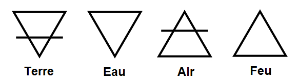 Les quatre éléments s’opposent deux à deux, l’eau avec le feu, la terre avec l’air : Eau/Feu, Terre/Air. Chacun des 4 éléments a son symbole, mais il n’y a que deux triangles pour 4 : la tête en haut ou la tête en bas. L’air et le feu, la terre et l’eau partagent le même triangle, on a donc une deuxième paire de paires : Air/Feu, Terre/Eau. À une petite différence près : la terre et l’air portent une barre transversale qui les distingue.