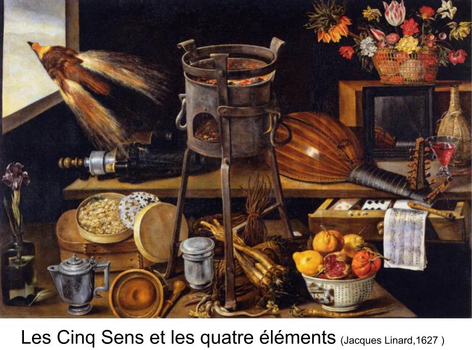 Une des premières approches serait d’essayer de faire correspondre les 4 éléments aux 5 sens; c’est par nos sens que nous appréhendons la matière et c’est le premier cartouche que découvre le compagnon. La vue correspond à la lumière, c’est-à-dire au feu du soleil. L’odorat correspond à l’air, c’est par le nez qu’on respire. Le toucher correspond à la terre, car le propre de l’homme c’est de toucher terre. Le goût ne peut venir que de l’eau, sans la salive aucun goût n’existe. Le cinquième élément serait donc à chercher du côté de l’ouïe. Pourtant elle est l’organe qui perçoit les sons c’est-à-dire les vibrations de l’air. Mais justement, elle est beaucoup plus que cela. L’oreille interne donne l’équilibre, elle nous situe dans l’espace. Elle possède aussi une fonction “radar” qui nous permet de percevoir les masses autour de nous et par exemple de nous mouvoir dans la foule. C’est le premier sens que développe le fœtus dans le ventre de sa mère avec le toucher, l’audition arrive en 6ème semaine, le seul des 5 sens qui permet au fœtus de percevoir quelque chose de l’extérieur.