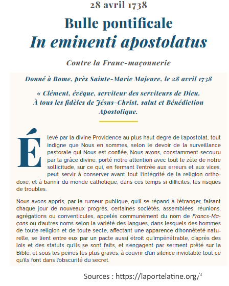 Certains évoquent une concurrence institutionnelle, d’autres un contexte historique, d’autres encore la peur du « syncrétisme » déiste. Quoiqu’il en soit, la bulle pontificale du 28 avril 1738 de Clement XII, intitulée « In eminenti apostolatus » donne « la faculté d’instruire et de procéder contre lesdits transgresseurs, de les réprimer et punir des peines qu’ils méritent, en invoquant même à cet effet, s’il le faut, le secours du bras séculier. »