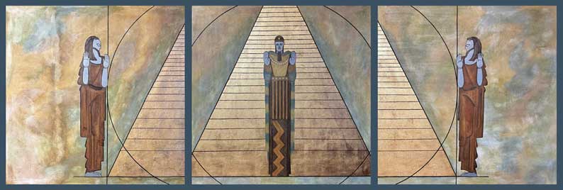On objectera qu’une fresque réduite à trois panneaux n’est plus l’immense page rêvée derrière l’Orient. C’est méconnaître la dynamique du symbole. Le symbole n’a pas besoin d’emporter le mur pour porter son sens. Il rayonne par tension plus que par extension. Ici, l’échelle resserrée concentre l’intensité : le triptyque devient un foyer, un athanor où la tradition s’actualise sans s’affadir. Cette économie des moyens relève d’une esthétique et d’une éthique : la beauté se tient dans la justesse, non dans la démesure. Le Temple, d’ailleurs, fut lui-même pensé dans cette rigueur : Art déco et Renaissance égyptienne, un alliage rare où la lisibilité structurelle est le vrai luxe. La main de Raoul Josset, sculpteur et compagnon des grands chantiers texans, a laissé dans la pierre cette leçon de tenue : forme accordée à la fonction, sobriété comme puissance maîtrisée. La fresque réapparaît comme la phrase qui manquait à cette syntaxe.