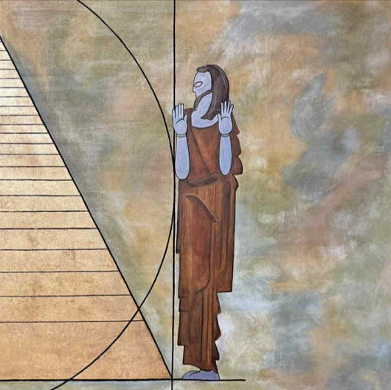 Trois panneaux : c’est la Sagesse qui ordonne, la Force qui soutient, la Beauté qui achève. Trois souffles : Pensée, Parole, Action. Trois postures : écouter, discerner, accomplir. Le triptyque ne se lit pas de gauche à droite comme un récit linéaire ; il se reçoit en étoile, depuis le centre vers les bords et retour, à la manière d’un souffle qui se concentre et se déploie. La figure centrale n’attire pas tout à elle ; elle redistribue. Les deux Jean ne sont pas des gardiens sourcilleux ; ils sont des passeurs d’équilibre. Et le cercle, posé comme une coupe, recueille ce qui risquerait de s’éparpiller. Cette dynamique radiale correspond à la pédagogie du Temple : entrer, se recentrer, rayonner.