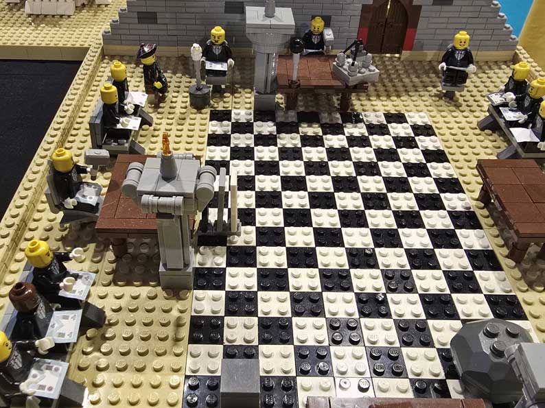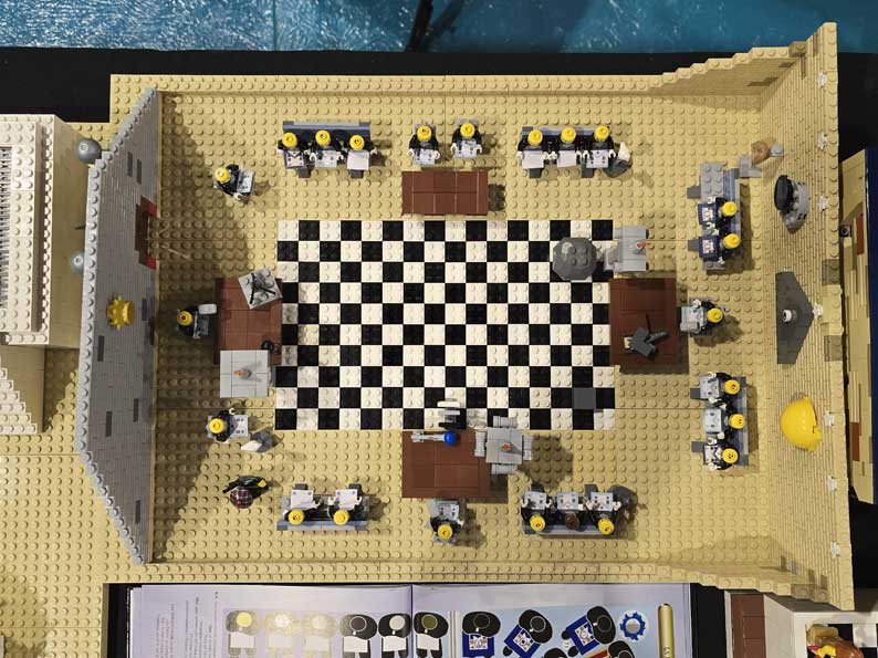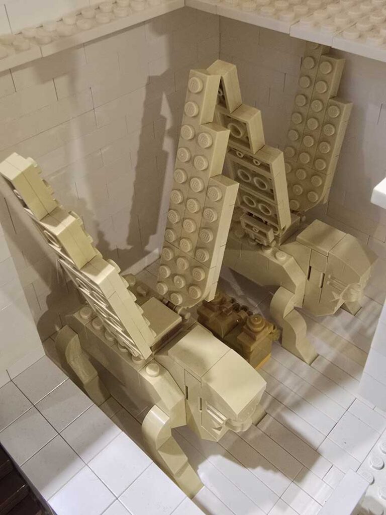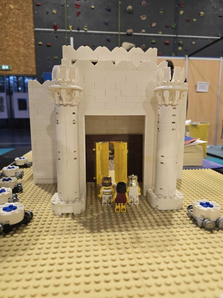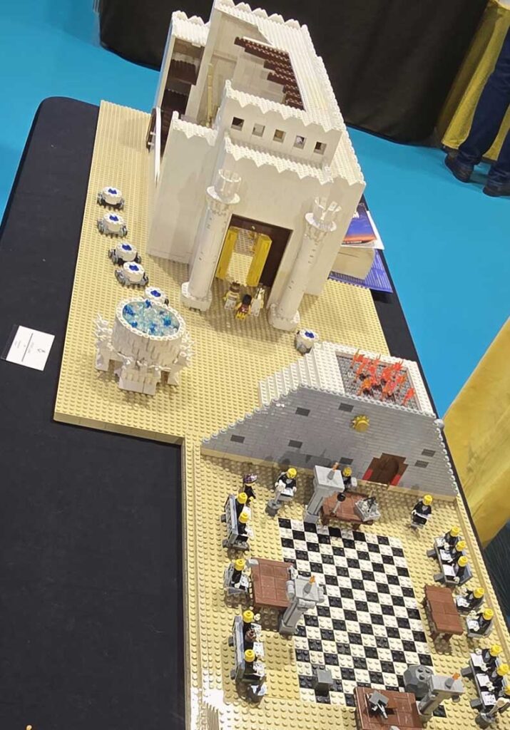 Vue du dessus, la Loge semble un plan tracé sur une planche à dessin ; au ras du sol, elle devient théâtre miniature où se rejoue le drame initiatique. Ce qui pourrait n’être qu’une jolie maquette devient alors outil d’instruction maçonnique. Lionel ne se contente pas « d’exposer du Lego » : il commente, il montre, il fait circuler la parole. Les enfants s’émerveillent devant les lions et les colonnes ; les adultes redécouvrent la structure du Temple, la place de la Mer d’airain, la succession des cours et des portes. Les Frères et les Sœurs, eux, s’arrêtent sur les correspondances : ici, le Saint des saints comme image du centre secret de l’être ; là, le pavement mosaïque de la Loge Émulation qui renvoie à notre propre marche entre lumière et ténèbres.
