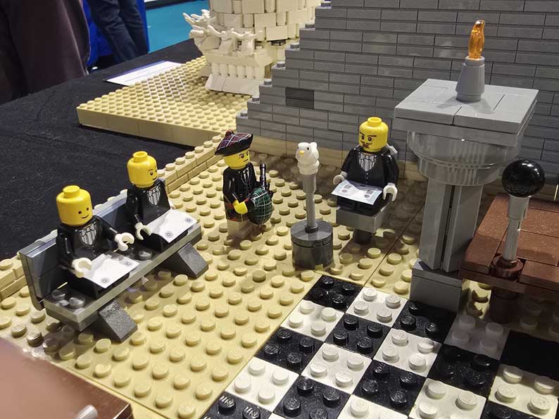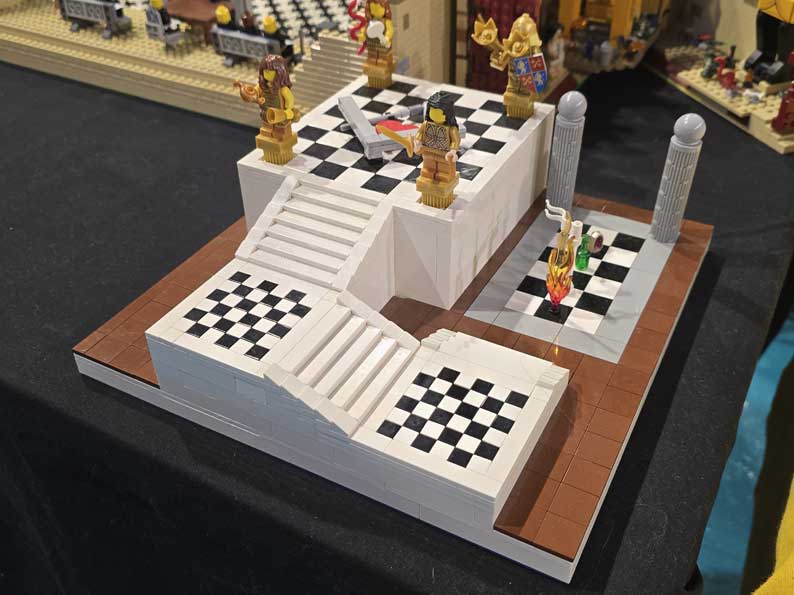 À côté, comme un clin d’œil fraternel, une Loge au Rite Anglais Style Émulation – rite qui est, parfois, le Rite de Grande Loge en France – déroule son tapis damier noir et blanc, que les Maçons nomme pavé mosaïque. On y reconnaît les plateaux, les colonnes, les trois grands piliers, les chandeliers, le pupitre du Frère qui parle, les sièges des membres, la place du Vénérable Maître, et même un Frère en kilt, cornemuse sous le bras, prêt à donner le ton de la Tenue. Sur une autre scène, surélevée, quelques figurines dorées gardent un pavement où reposent un cœur rouge et les outils de l’Art Royal : comme si la brique jouait à nous rappeler que toute construction ne vaut que par l’amour fraternel qui l’anime.