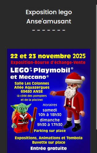 Et si tu souhaites découvrir cette œuvre de tes propres yeux, retrouve Lionel ce dimanche 23 novembre 2025, de 9 h 30 à 17 h 30, à l’exposition « Lego Anse’amusant », grande exposition–bourse d’échange–vente dédiée aux LEGO, Playmobil et Meccano. Cela se passe à la Salle Les Colonnes, allée Aquazergues, 69480 Anse (à côté des pompiers et de la piscine). Au programme : expositions, animations, tombola, buvette sur place, parking à proximité et entrée gratuite. Sur l’affiche, un Père Noël Playmobil et un Yoda Lego se tiennent côte à côte, comme un clin d’œil joyeux à la rencontre des imaginaires… et, pourquoi pas, à la rencontre de tous les chercheurs de lumière.