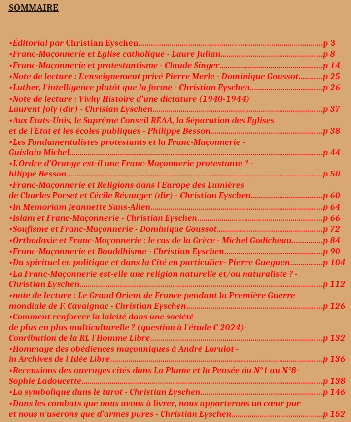Au centre de ce chantier se tient Christian Eyschen, figure familière de la Libre Pensée, qui assume dans ce numéro un rôle de maître d’œuvre discret et tenace. Militant laïque, historien des combats pour la séparation des Églises et de l’État, animateur de revues engagées, il ne se contente pas de coordonner. Il contribue par de nombreux textes, qu’il s’agisse des rapports entre islam et Franc Maçonnerie, des liens avec le bouddhisme, d’une méditation sur Luther, d’une interrogation serrée sur la religion naturelle, ou encore de recensions d’ouvrages maçonniques et historiques. Sa bibliographie, que ce numéro laisse deviner plutôt qu’il ne l’étale, se tisse de brochures de la Libre Pensée, d’essais sur la guerre et les obédiences, de travaux sur les rites maçonniques et sur les fonds d’archives réunis au sein de l’IRELP. Le portrait qui se dégage est celui d’un frère qui a choisi de faire de l’écriture un outil de service, de la recherche un prolongement de l’initiation, de la laïcité une discipline intérieure autant qu’un combat public.