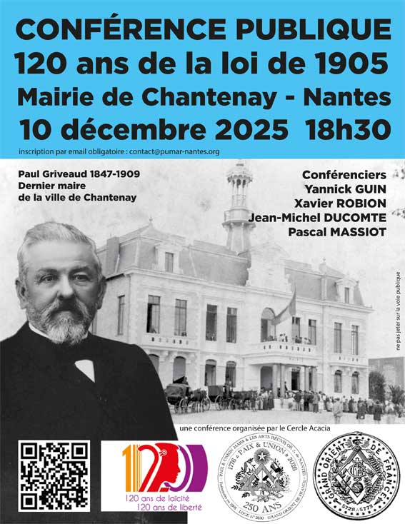Le 9 décembre 1905, l’Assemblée nationale votait la loi concernant la séparation des Églises et de l’État. Cent vingt ans plus tard, jour pour jour, Nantes célèbrera cet anniversaire fondateur de la République laïque par une soirée exceptionnelle ouverte à tous.Mercredi 10 décembre 2025 à 18 h 30, le Cercle Acacia – association culturelle de la Respectable Loge « Paix et Union Mars et les Arts Réunis » du Grand Orient de France – invite le public nantais à une conférence-débat gratuite (inscription obligatoire).