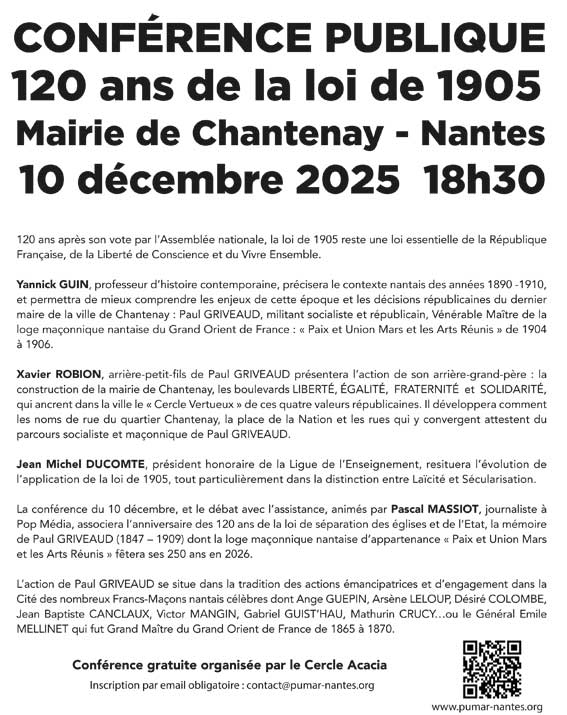 À l’heure où la laïcité est parfois mal comprise ou instrumentalisée, cette rencontre offrira un moment rare : revenir aux sources d’un texte qui garantit à la fois la liberté de conscience et la neutralité de l’État, tout en découvrant comment des élus et des citoyens – dont de nombreux francs-maçons nantais – l’ont mis en œuvre concrètement dans les rues de notre ville.