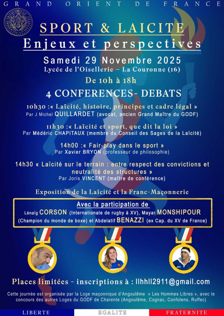 Aujourd’hui, samedi 29 novembre 2025, le Grand Orient de France donne rendez-vous au lycée de l’Oisellerie, à La Couronne (Charente), pour une grande journée publique « Sport & Laïcité – Enjeux et perspectives » de 10 h à 18 h. Une journée à vivre ensemble, ouverte à toutes et à tous, où se croisent le monde sportif, la réflexion citoyenne et l’engagement laïque.
