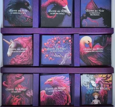 Le plateau est structuré autour des trois phases du Grand Œuvre alchimique : le noir de la dissolution (où l’on déconstruit les illusions), le blanc de la purification (pour clarifier l’essence) et le rouge de l’accomplissement (la renaissance). Deux modes de jeu s’offrent aux joueurs : une version courte, où six pierres suffisent pour remporter la partie, parfaite pour une soirée rapide ; ou la partie complète, exigeant neuf pierres pour achever le Grand Œuvre, pour les passionnés prêts à une immersion totale.