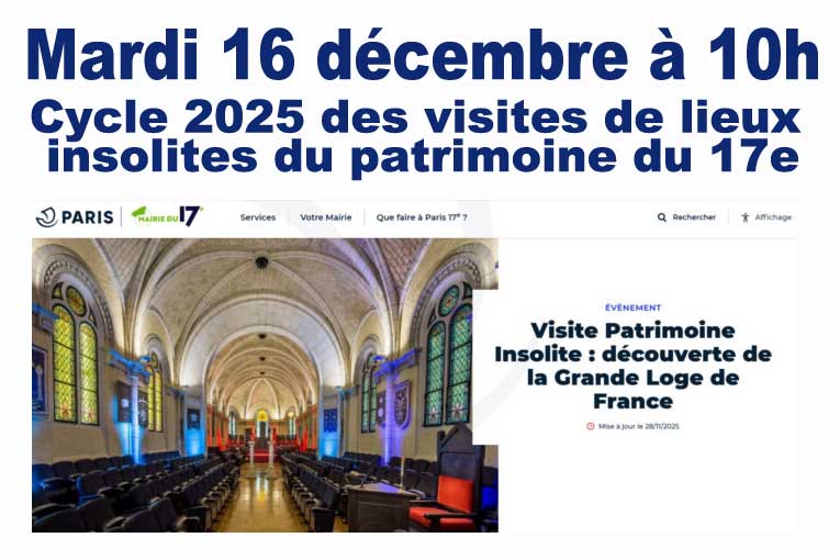 Mardi 16 décembre à 10h, dans le cadre du cycle 2025 des visites de lieux insolites du patrimoine du 17ᵉ, la Mairie du 17ᵉ vous propose une immersion exceptionnelle au sein d’un site rarement ouvert au public : la Grande Loge de France.