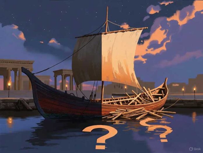 Le bateau de Thésée, dans sa cale, n’est plus un vaisseau de bois, mais un symbole : remplacez toutes les planches, et ce qui reste n’est ni la matière ni la forme, mais l’intention qui les traverse, le voyageur qui le navigue.