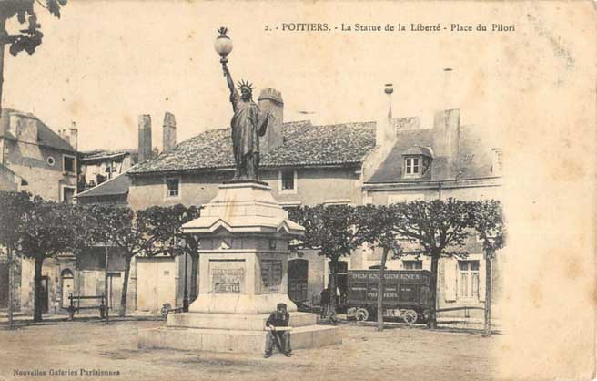 En 1822, le général Jean-Baptiste BERTON est exécuté sur cette place, alors dénommée place du pilori, pour complot ; ses dernières paroles furent « Vive la France, Vive la liberté ». Afin de lui rendre hommage, les Loges maçonniques de Poitiers et de Neuville levèrent une souscription afin de financer l’acquisition de cette réplique de la « Statue de la Liberté » et de son socle sur l’une des faces duquel il en est fait mention. Elle fut inaugurée le 14 juillet 1903.