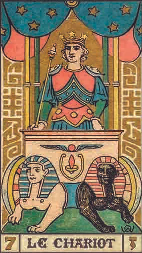 Le Chariot est une promesse : celle que tout est possible à celui qui sait unir sa volonté (le conducteur) aux forces de la nature (les sphinges). C’est la foi dans l’avenir qui permet de tracer sa route.