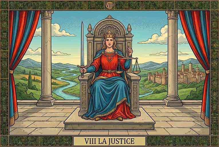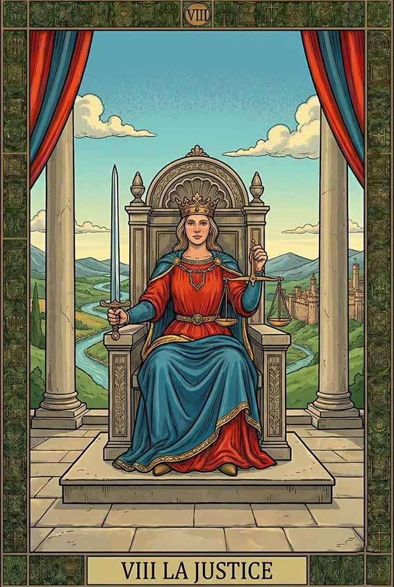 La Justice est la carte de la maturité. Elle marque la fin de l’insouciance du jeune Bateleur. Elle nous apprend que chaque acte est une graine qui portera obligatoirement un fruit, doux ou amer.