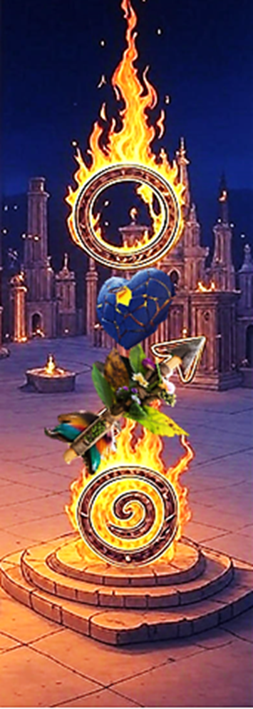 Dans la Forge, les symboles durent confronter leurs propres essences. La Flèche offrit sa détermination, l’Étoile son espoir, la Spirale son mystère. Ensemble, ils modelèrent une nouvelle forme : une Étreinte, deux lignes courbes se rejoignant comme des bras ouverts. Elle n’était pas le Cœur, mais elle portait une promesse de connexion, de chaleur, d’unité.