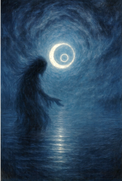 L’Ombre guida un groupe de symboles — la Flèche, l’Étoile, la Spirale, et l’Étreinte — vers les Confins Ténébreux, un lieu où aucun symbole n’osait s’aventurer. Là, dans un lac d’obscurité miroitante, l’Ombre leur montra sa propre origine. « Je suis née lorsque le premier symbole a vu le jour », expliqua-t-elle. « Chaque symbole crée une ombre, car chaque vérité projette un doute. Je suis ce doute, mais aussi la possibilité de redécouvrir le sens. »