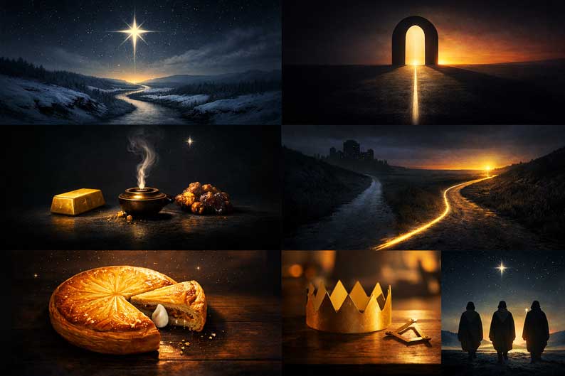 Certaines légendes viennent de loin et finissent par habiter nos maisons. L’Épiphanie n’ajoute pas une histoire au calendrier : elle ouvre un passage. Trois voyageurs suivent une étoile, cherchent un Roi, rencontrent un enfant, offrent l’or, l’encens et la myrrhe, puis reviennent autrement. Et, en France, cette méditation devient un rite de table : la galette, la fève, la couronne. Du ciel à la table, une même pédagogie s’écrit : discerner, se transformer, servir la Lumière.