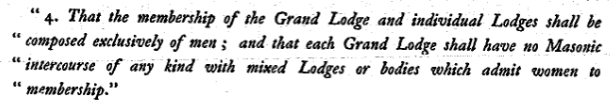 En 1929, la Grande Loge Unie d’Angleterre édicta ses Principes de base qui sont toujours en application parmi lesquels apparaît très nettement la séparation homme/femme : « que les membres de la Grande Loge et des Loges individuelles soient exclusivement des hommes, et qu’aucune Grande Loge ne doit avoir quelque relation maçonnique que ce soit avec des Loges mixtes ou des obédiences qui acceptent des femmes parmi leurs membres ».