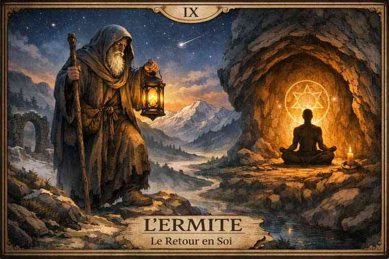 L’Ermite (IX) est vieux, sec, solitaire, et il cache sa lumière (il protège, il retient). C’est la concentration extrême.