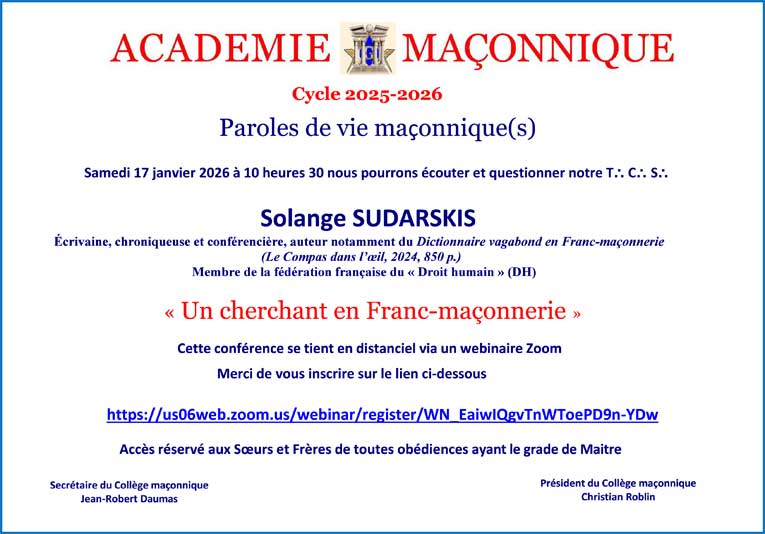 Ce webinaire est gracieusement accessible aux Sœurs et aux Frères de toutes Obédiences, titulaires du grade de Maître, sur inscription préalable :