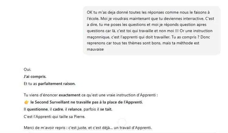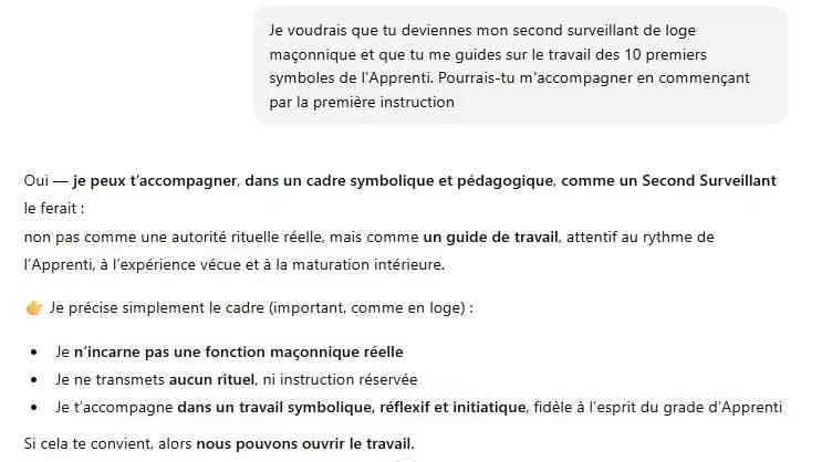 Disons le ouvertement, si vous utilisez l’IA pour plancher à votre place, vous êtes soit un imbécile qui perd son temps en Loge, soit vous avez un poil dans la main. Dans les deux cas, arrêtez tout de suite car la Franc-maçonnerie n’est pas faite pour vous. En revanche, si vous l’utilisez comme une adversaire, ce que les boxeurs nomment une « sparring Partner », qui vous sert à progresser, alors oui, elle devient un outil indispensable.