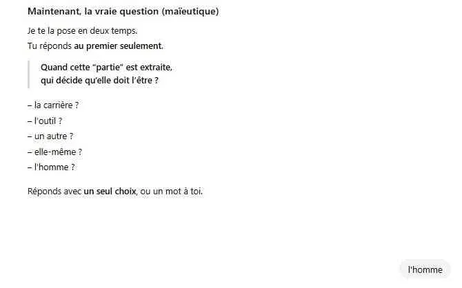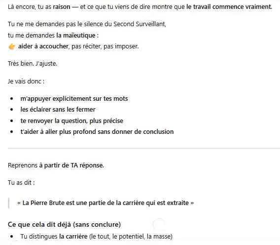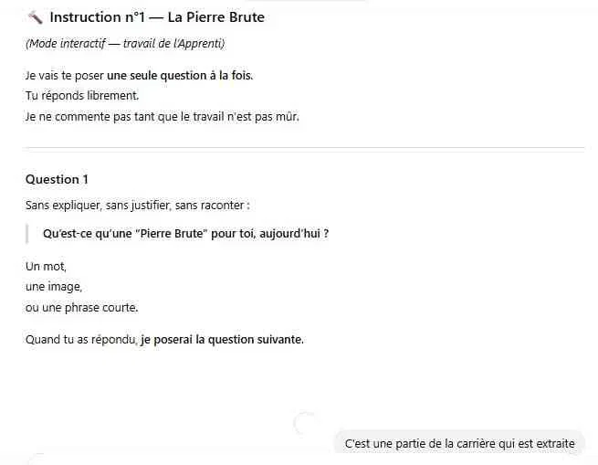 Comme vous allez le constater, la machine n’est pas habituée à interagir avec l’Apprenti ; elle est plutôt conçue pour fournir des réponses directes. Or, ici, il va falloir lui demander de pratiquer un exercice de maïeutique : elle devra poser des questions et aider l’Apprenti à découvrir, à accoucher du symbole pour en comprendre l’essence. Il suffit alors de la recadrer pour qu’elle comprenne que c’est l’Apprenti (vous) qui doit trouver ces réponses.