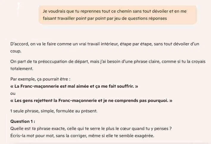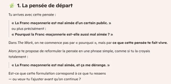 Nous avons demandé à Copilot avec le casque sur la tête s’il pouvait nous aider à travailler avec la méthode de Byron Katie. Nous avons posé la question suivante : « En utilisant la méthode de Byron Katie, peux tu me dire pourquoi la Franc-maçonnerie est-elle aussi mal aimée d’un certain public ? »
